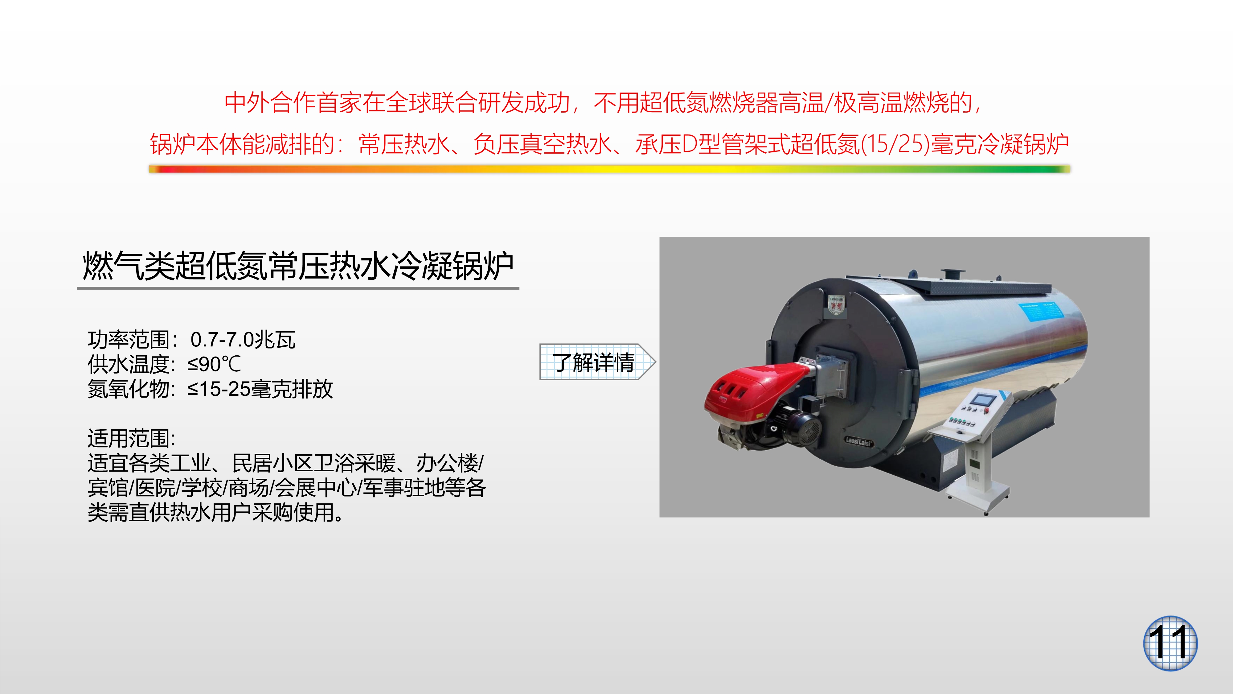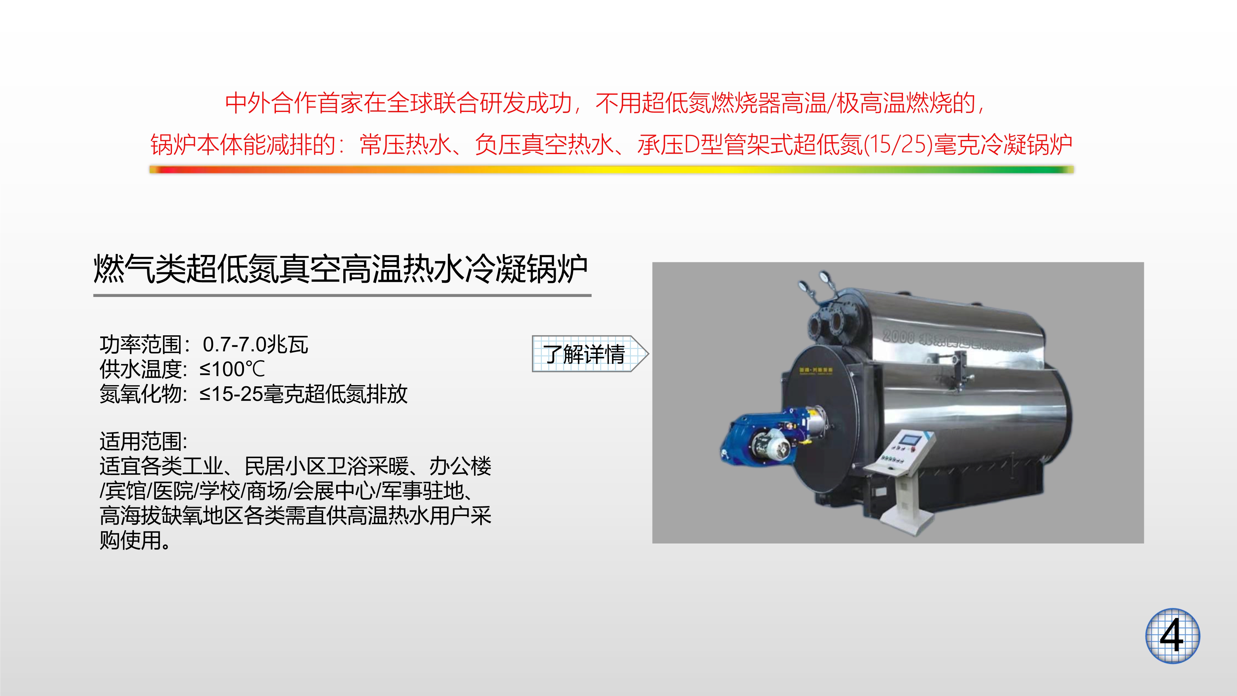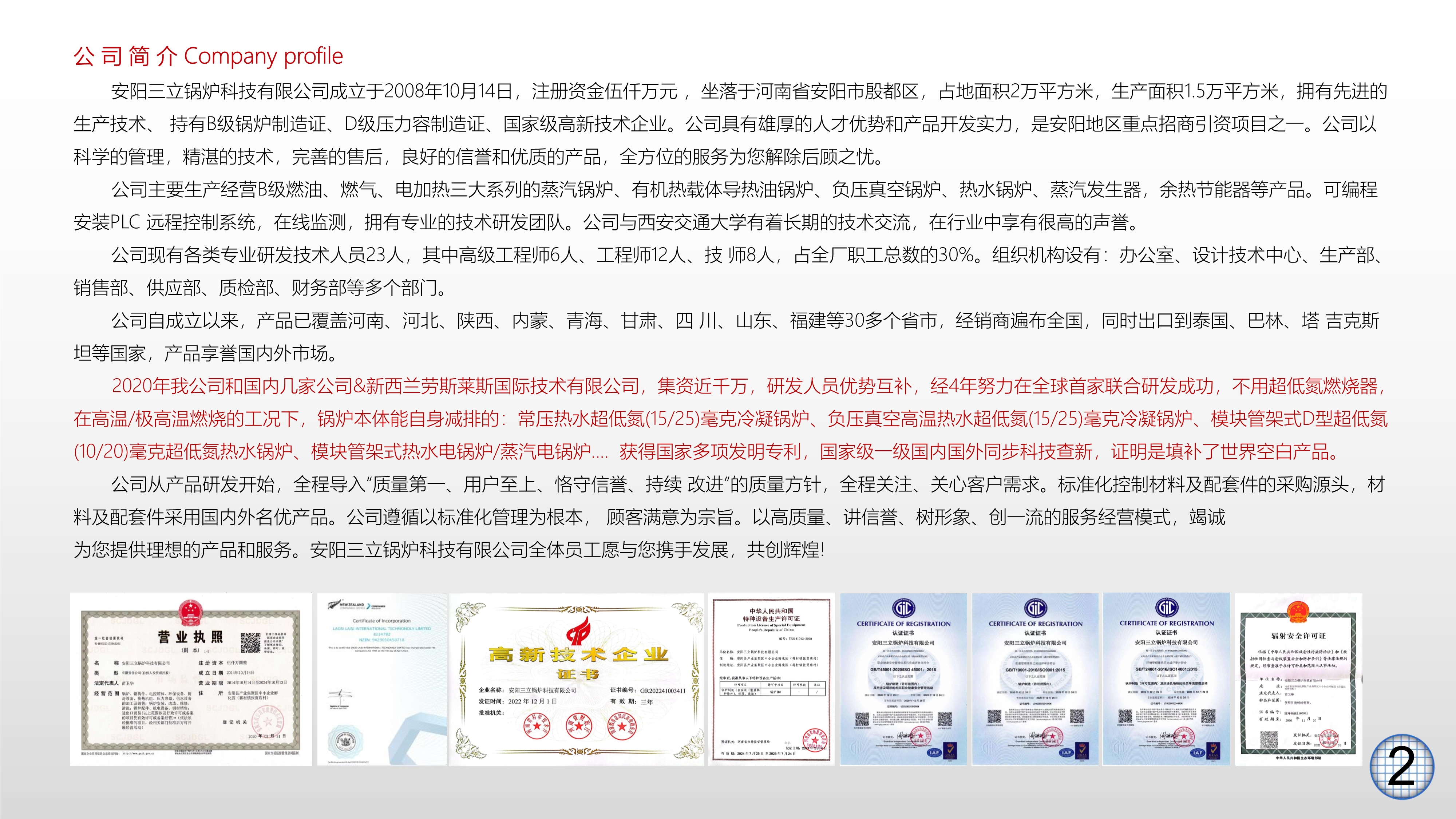公司主要生産(chǎn)經營燃油、燃氣、電加熱三大系列的蒸汽鍋爐、常壓熱水爐、真空鍋爐/真空熱水鍋爐、熱載體導(dǎo)熱油鍋爐、不鏽鋼飲水鍋爐、開水爐,蒸汽發生器,煙氣器等産(chǎn)品。